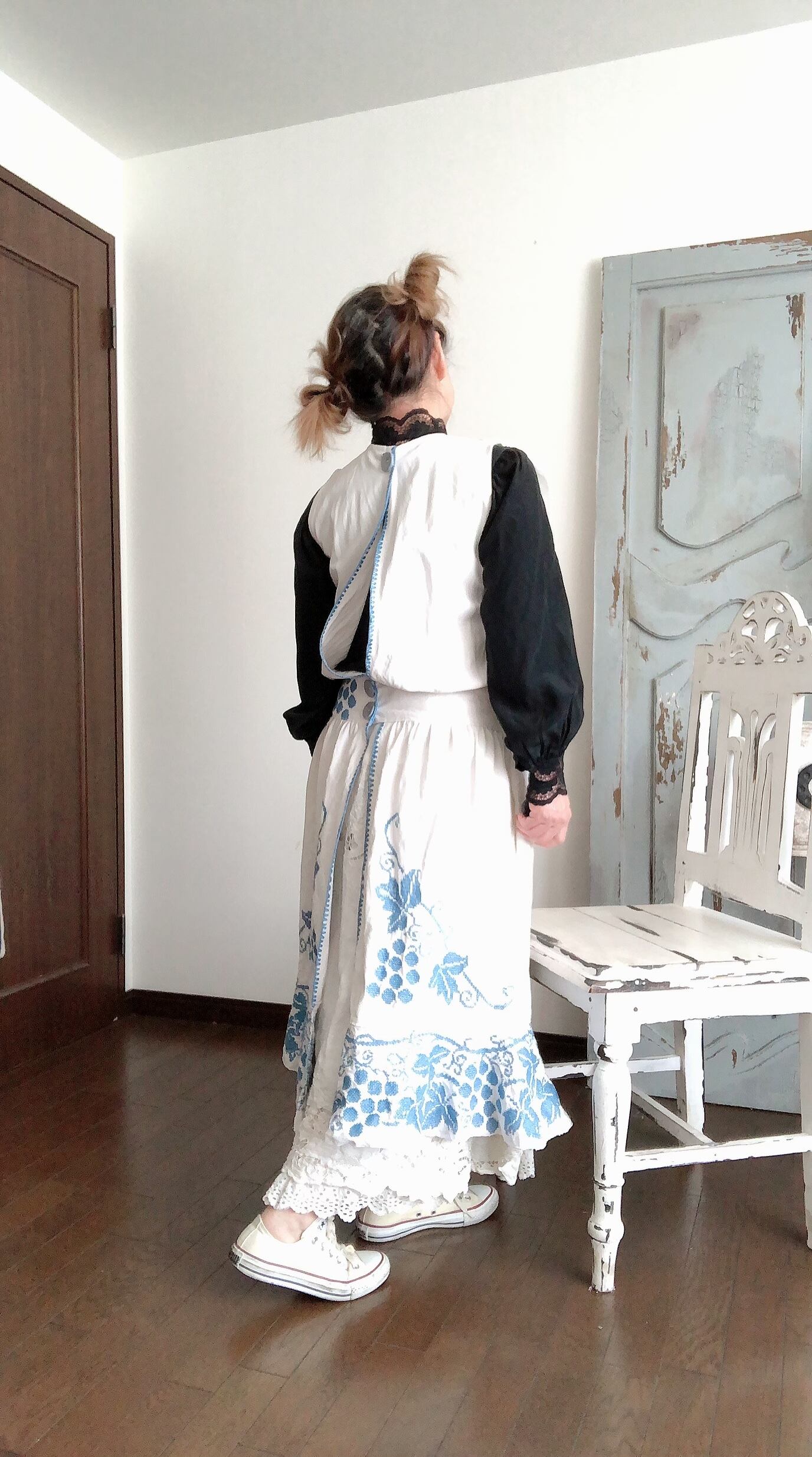 画像では私は黒のブラウスとロングスカートを着用していますが
