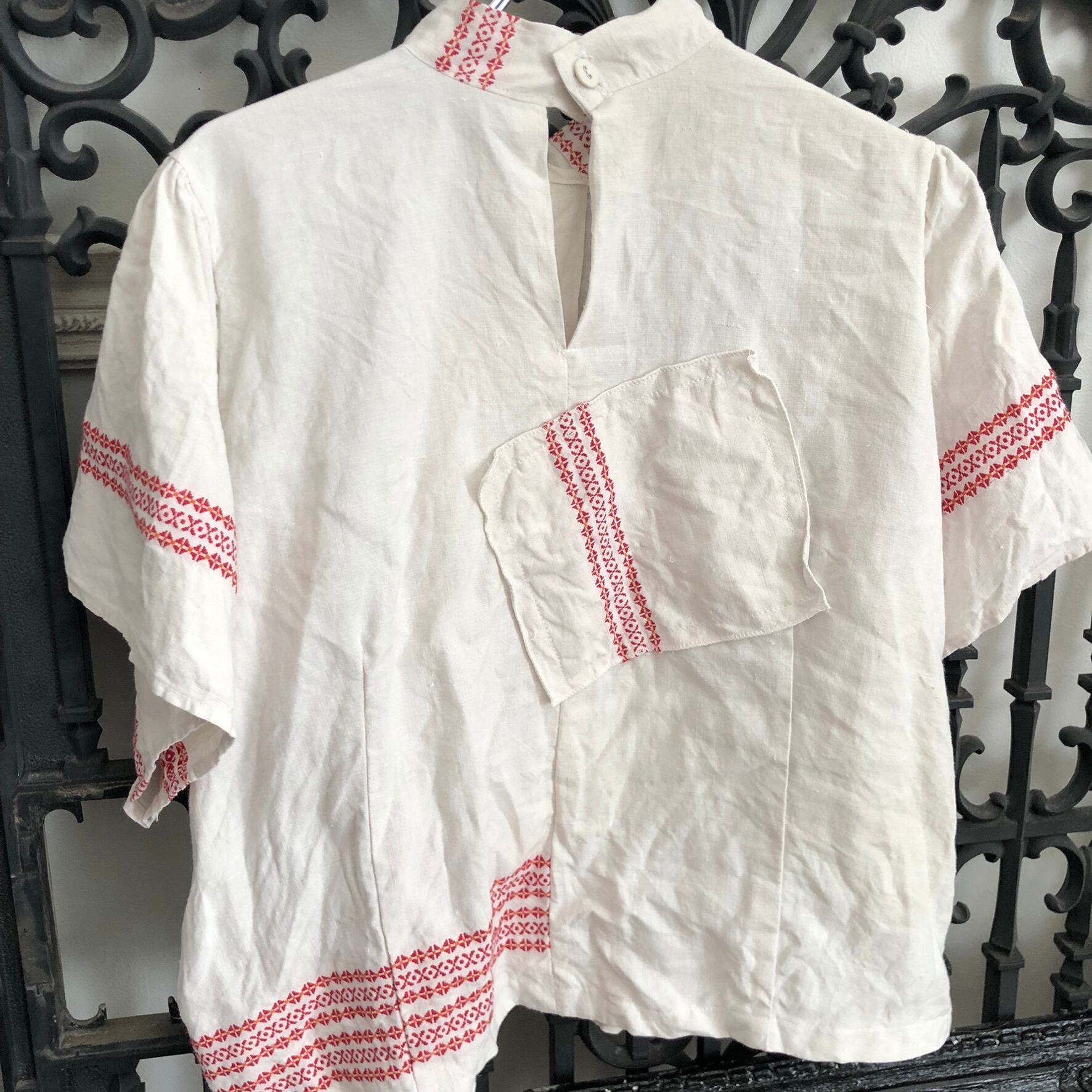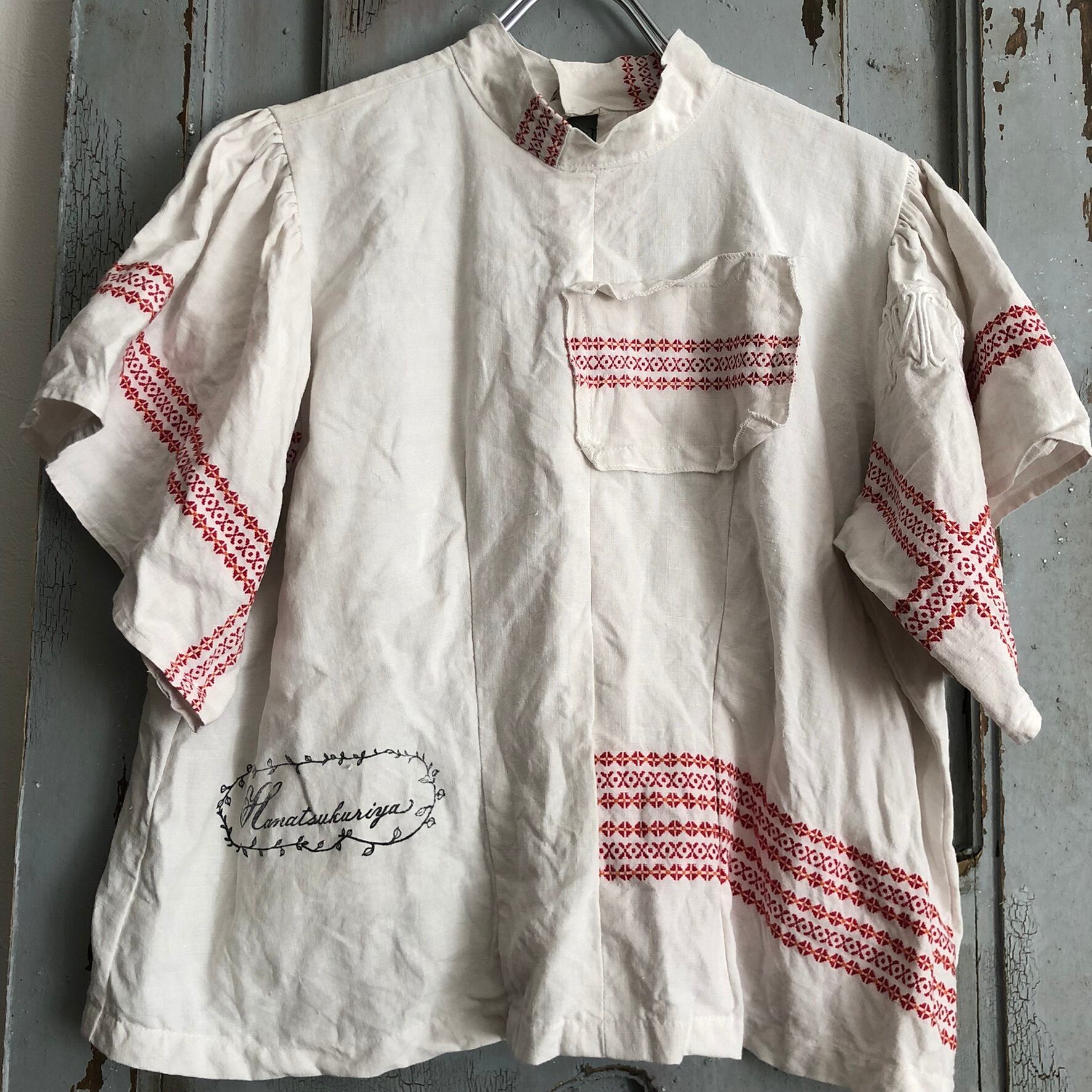 antique linenの刺繍布で salopette blouse &salopetteを作りました écruにredの刺繍が可愛らしく刺繍部分がバランス良く見える工夫をしていますそして blouseと一緒に着たり別々に着たり沢山楽しんで下さいね